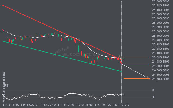 NAS100 was identified around 24922.8906 after recently rebounding off the resistance on the 15 Minutes interval. Ultimately, the stock’s price action has formed a Falling Wedge pattern. This squeeze may increase the chances of a strong breakout. The projected move could take the price to around 24589.0328.