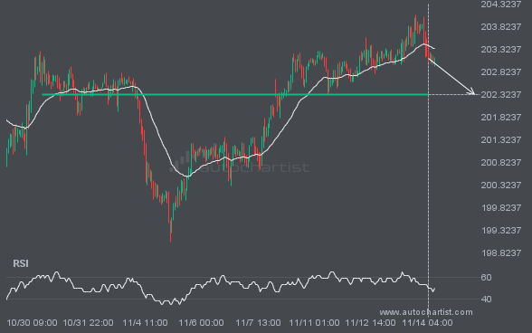 GBPJPY is approaching the line at 202.3180. If this move continues, the price of GBPJPY could test 202.3180 within the next 3 days. But do not rush to trade. It has tested this line many times in the past, so the move could be short-lived and end in a rebound.