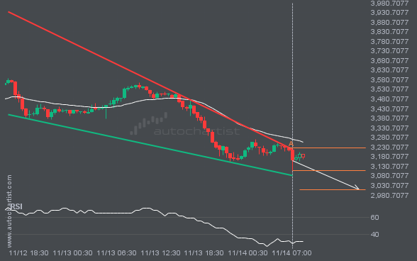 An emerging Falling Wedge has been detected on ETHUSD. The pattern has not yet broken through resistance, but the price is expected to move up over the next few hours. At the time the pattern was found, the price was 3109.51, and it is expected to move to 3008.7974.