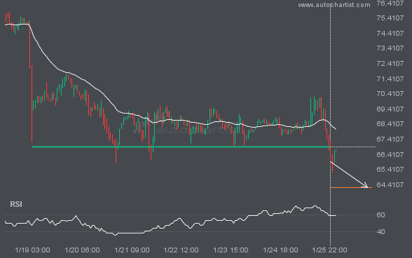 LTCUSD has broken through a support line. Since it has previously retraced from this price, wait for confirmation of the breakout before trading. It has touched this line several times over the past 7 days. This suggests a possible target around 64.2160 within the next 2 days.