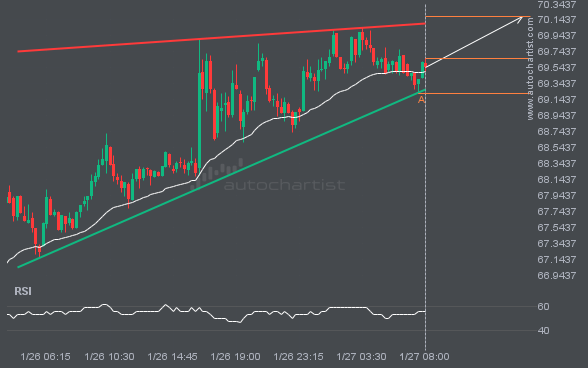 A Pennant pattern was identified for LTCUSD at 69.66, suggesting it may move toward the resistance line at 70.1868. It may break through that line and continue the bullish trend, or reverse from it.