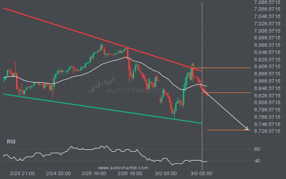 S&P500 was identified around 6833.78 after recently rebounding off the resistance on the 1 hour interval. Ultimately, the stock’s price action has formed a Falling Wedge pattern. This squeeze may increase the chances of a strong breakout. The projected move could take the price to around 6729.9590.