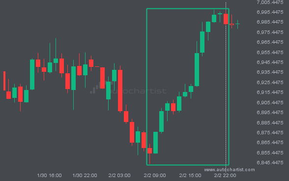 S&P500 has broken through the resistance line of a Triangle technical chart pattern. Because it has retraced from this line in the past, you should wait for confirmation of the breakout before taking any action. It has touched this line twice in the last 13 days, suggesting a possible target level around 7027.2055 within the […]