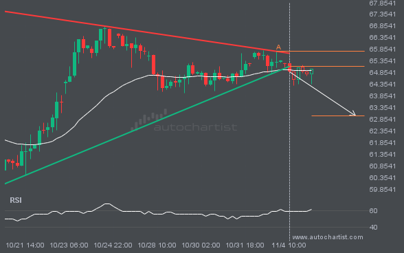 BRN/USD has broken through the support line which it has tested twice in the past. We have seen it retrace from this line before, so one should wait for confirmation of the breakout before trading. If this new trend persists, a target level of around 63.0052 may materialize within the next 3 days.