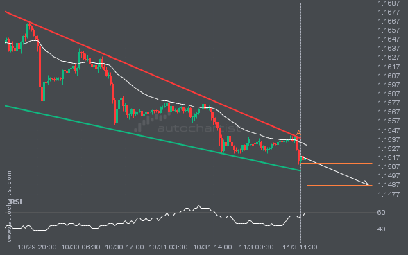 EURUSD is moving towards a support line. Because we have seen it retrace from this line before, we could see either a break through this line, or a rebound back to current levels. It has touched this line numerous times in the last 6 days and may test it again within the next 19 hours.
