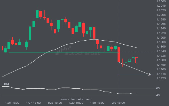 EURUSD has broken through a support line. Because it has previously retraced from this price, you should wait for confirmation of the breakout before trading. It has touched this line multiple times over the past 8 days, which suggests a possible target around 1.1740 within the next 8 hours.