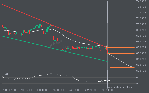 BRN/USD is moving toward a support line it has tested many times. It has retraced from this line before, so it’s unclear whether it will break through or rebound again. If BRN/USD continues on its current trajectory, it could reach 63.1494 within the next 12 hours.