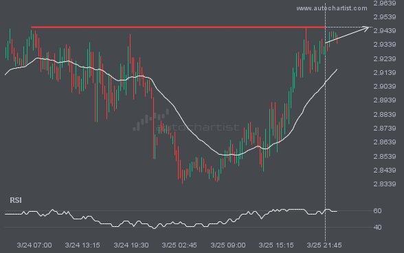 NGC/USD has broken through the support line of a Triangle pattern and suggests a possible move to 2.8486 within the next 6 hours. It has tested this line before, so it is prudent to wait for confirmation of the breakout before taking action. If the breakout is not confirmed, we could see a retracement back […]