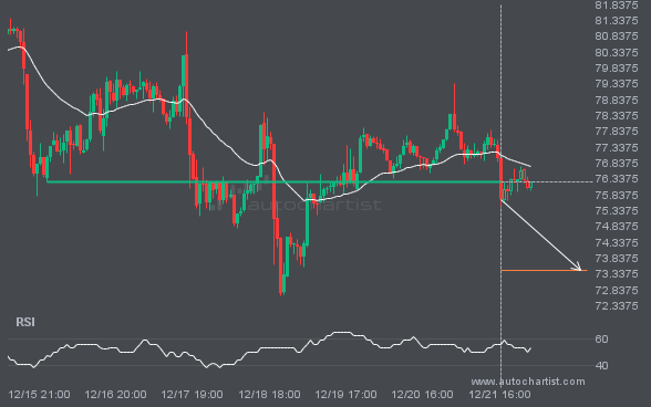 LTCUSD has broken through a line at 76.2300. If this breakout holds, we could see the price of LTCUSD move toward 73.4370 within the next 2 days. However, don’t be too quick to trade. It has tested this line many times in the past, so confirm the breakout before placing any trades.