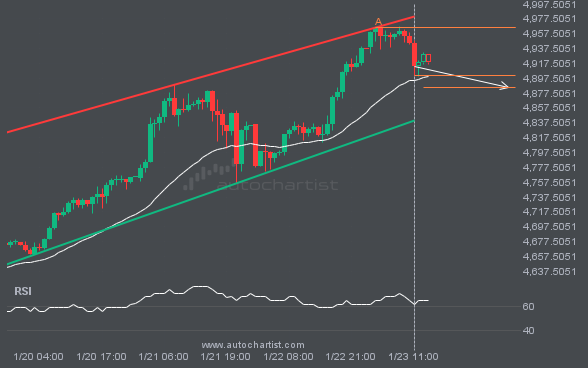 S&P500 is moving toward a resistance line. Since it has retraced from this line before, we may see either a breakout through it or a rebound to current levels. It has touched this line multiple times in the past 4 days and may test it again within the next 21 hours.