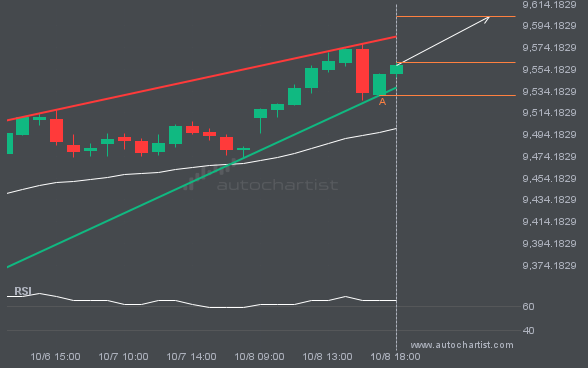 An emerging Rising Wedge has been detected on FTSE100 on the 1 hour chart. There is a possible move towards 9602.6588 next few candles. Once reaching support it may continue its bullish run or reverse back to current price levels.