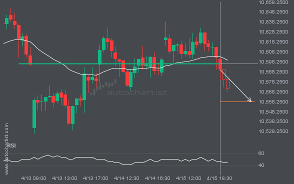 FTSE100 has broken through a support line. Because it has previously retraced from this price, you should wait for confirmation of the breakout before trading. It has touched this line multiple times over the past 6 days, which suggests a possible target around 10557.9355 within the next 5 hours.