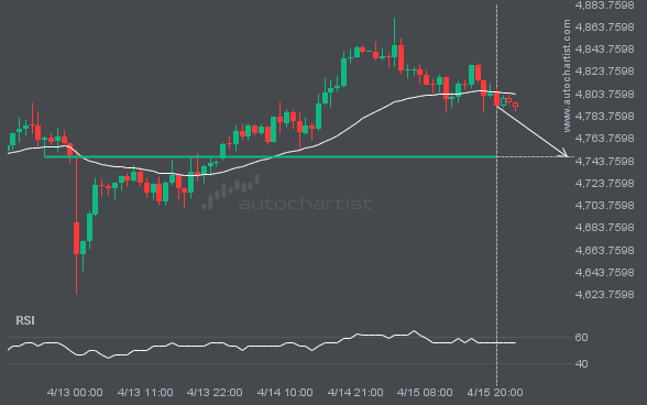 BTCUSD is moving toward a support line. Since it has retraced from this line before, we may see either a breakout through it or a rebound to current levels. It has touched this line multiple times in the past 12 days and may test it again within the next 3 days.