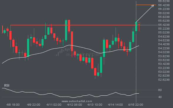 LTCUSD has broken through a resistance line. Because it has previously retraced from this price, you should wait for confirmation of the breakout before trading. It has touched this line multiple times over the past 8 days, which suggests a possible target around 56.4360 within the next 2 days.