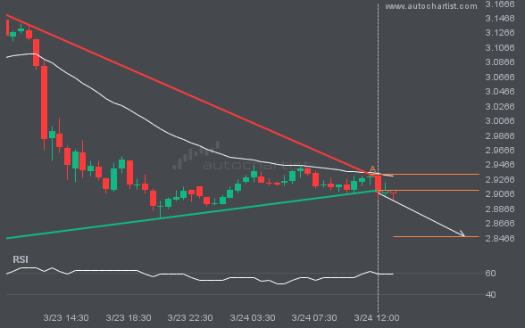 NGC/USD has broken through the support line of a Triangle pattern and suggests a possible move to 2.8486 within the next 6 hours. It has tested this line before, so it is prudent to wait for confirmation of the breakout before taking action. If the breakout is not confirmed, we could see a retracement back […]