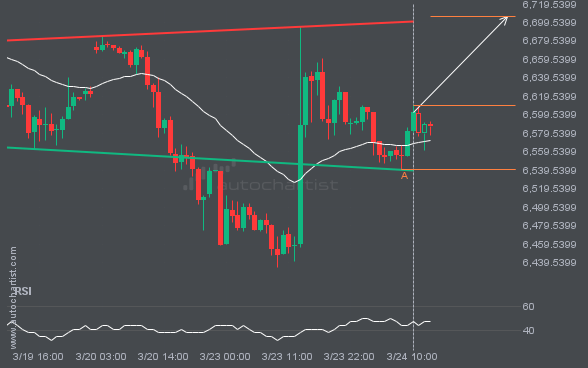 S&P500 was identified around 6610.02 after recently rebounding off the support on the 1 hour interval. Ultimately, the stock’s price action has formed a Inverse Head and Shoulders pattern. This squeeze may increase the chances of a strong breakout. The projected move could take the price to around 6705.9685.