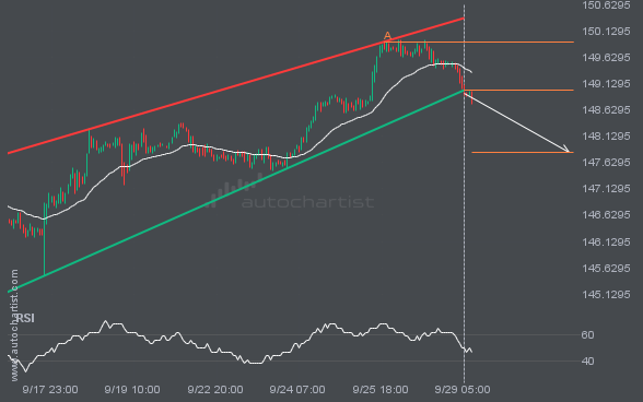 This trade setup on USDJPY is formed by a period of consolidation; a period in which the price primarily moves sideways before choosing a new direction for the longer term. Because of the bearish breakout through support, it seems to suggest that we could see the next price move to 147.8176.