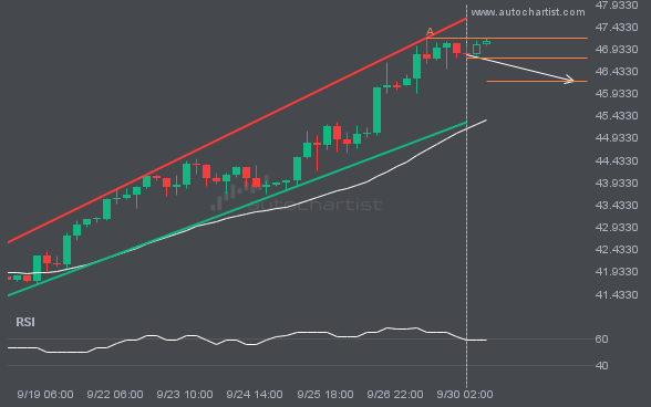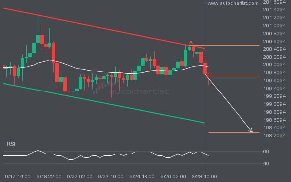 Emerging Channel Down detected on GBPJPY – the pattern is an emerging one and has not yet broken through resistance, but the price is expected to move up over the next few hours. The price at the time the pattern was found was 199.7315 and it is expected to move to 198.2898.