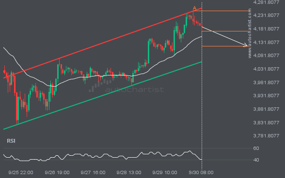 Emerging Channel Up pattern in its final wave was identified on the ETHUSD 1 hour chart. After a strong bearish run, we find ETHUSD heading towards the upper triangle line with a possible resistance at 4116.8918. If the support shows to hold, the Channel Up pattern suggests a rebound back towards current levels.
