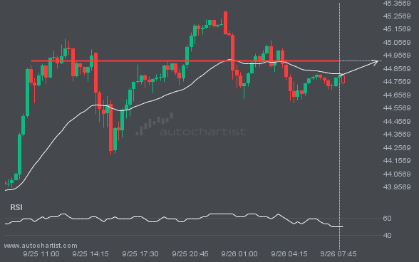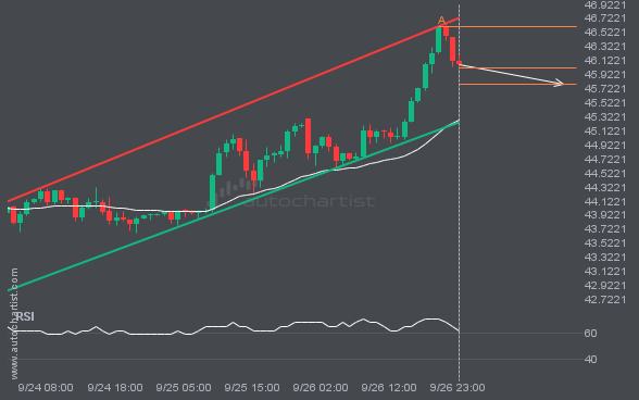 Emerging Channel Up pattern in its final wave was identified on the XAGUSD 1 hour chart. After a strong bearish run, we find XAGUSD heading towards the upper triangle line with a possible resistance at 45.7884. If the support shows to hold, the Channel Up pattern suggests a rebound back towards current levels.